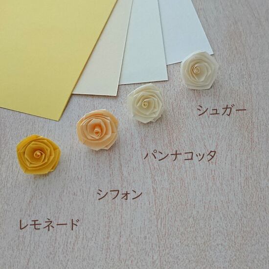 自社のクイリングペーパーや太幅ペーパーと同じ紙を使っているので色合わせしやすく全体の作品がしっくりなじみます。フリンジや折り薔薇なら1枚から15枚取れる大きさです。