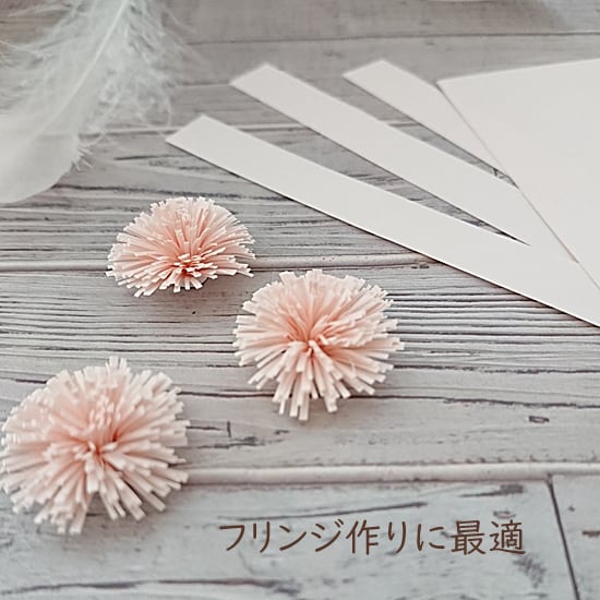 自社のクイリングペーパーや太幅ペーパーと同じ紙を使っているので色合わせしやすく全体の作品がしっくりなじみます。フリンジや折り薔薇なら1枚から15枚取れる大きさです。