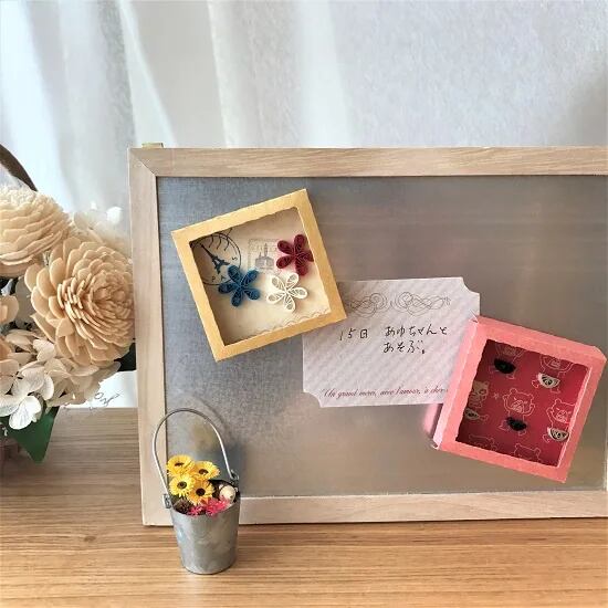 作った作品をそのまま飾るより額縁に入れるだけで更にグレードアップ。どんどん出来上がる作品を気軽に飾れるのがこの紙のフレーム。